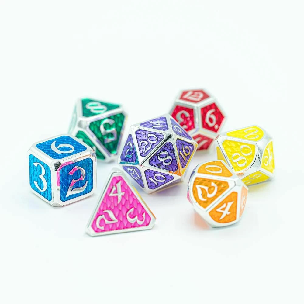 • Detailed in our exclusive Drakona dragonscale inlay in rainbow colors (pink d4, purple d20, blue d6, green d8, red d12, orange d10, and yellow d%) with silver electroplating