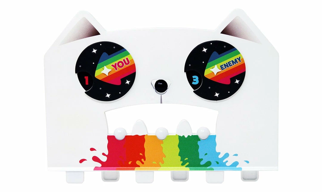 Using the magnetic Kitty Paw Flicker, players must launch colorful balls through Rainbow Ralphing Cat’s Mouth and onto their opponent’s side.