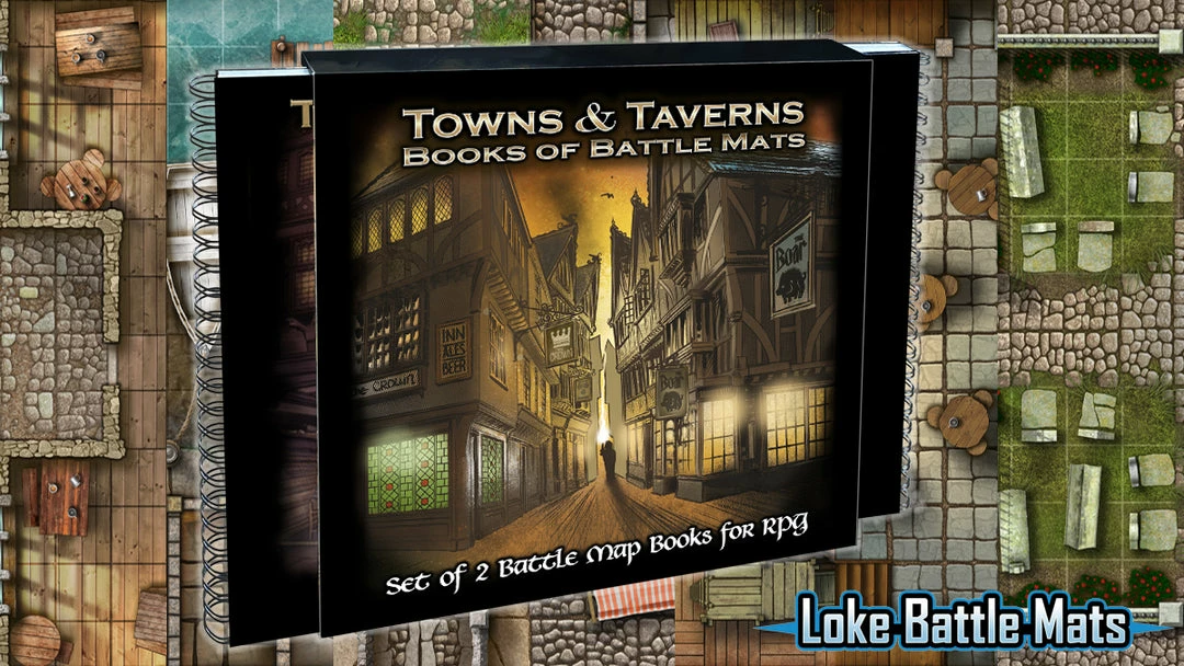 Attention Adventurers! Grab your dice and get ready to roll with our modular books of lay flat wipe clean map books! Towns & Taverns Books of Battle Mats is a set of two books of RPG battle maps which line up to create one endlessly evolving unban fantasy battle map. Standard entry/exit points and a 360 spine allow you to create anything up to a 24×24 play area from a set of books that fits on your bookshelf and in your bag!