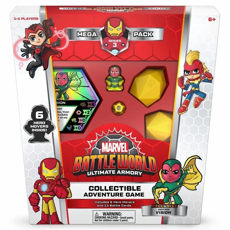 Pick your Heroes, rescue your friends, and win enough battles to defeat Thanos! Battleworld is a revolutionary, cooperative, expandable, collectible adventure game featuring dozens of characters from across the Marvel Universe! As you play, crack open mysterious Thanostones to reveal the characters inside. There are more than 30 new characters to collect! This Mega Pack jumpstarts your collection with six characters, including two mystery Heroes trapped in Thanostones and an exclusive Vision (Classic) with foil card!