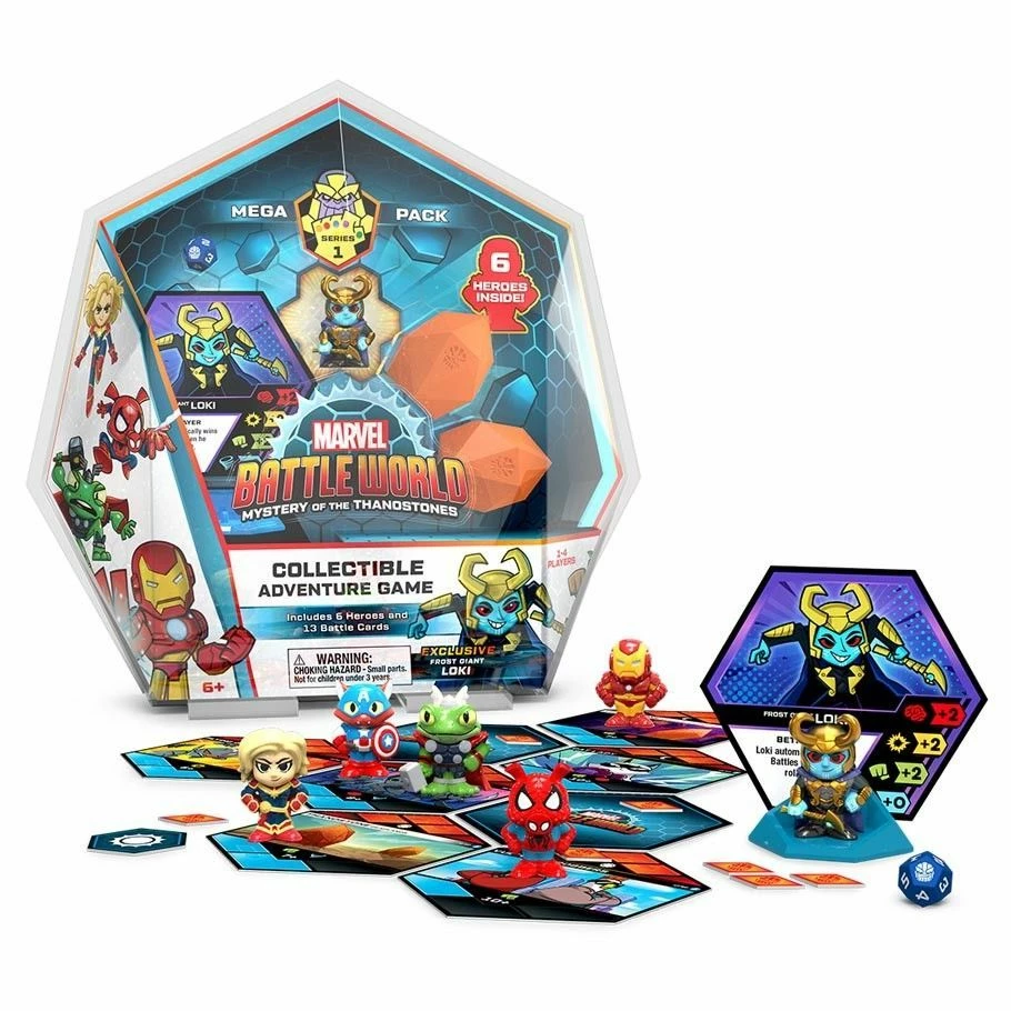 Pick your favorite Hero, rescue your friends, and win battles to defeat Thanos! Battleworld is a revolutionary cooperative, expandable, collectible adventure game featuring dozens of characters from all over the Marvel Universe! Players get to crack open the mysterious Thanostones during the course of play to reveal the mystery character inside for a constant sense of surprise and delight! Mega Packs let you jumpstart your collection with six characters: four starting Heroes [including an exclusive Loki (Frost Giant) variant] and two more trapped in Thanostones! -Unique team-based or solo gameplay allows players to jump into Battleworld right away! -Collectible characters come with their own game cards for immersive, cooperative play. Collect all the unique powers and abilities! -Free the mystery character from the “Thanostone.” Each time you crack one open, it’s a surprise! -Launch series includes 30+ unique characters including rare variants! -Includes a new Hero ONLY available in this Mega Pack – Loki (Frost Giant)! -More playability, more engagement, more purchases!