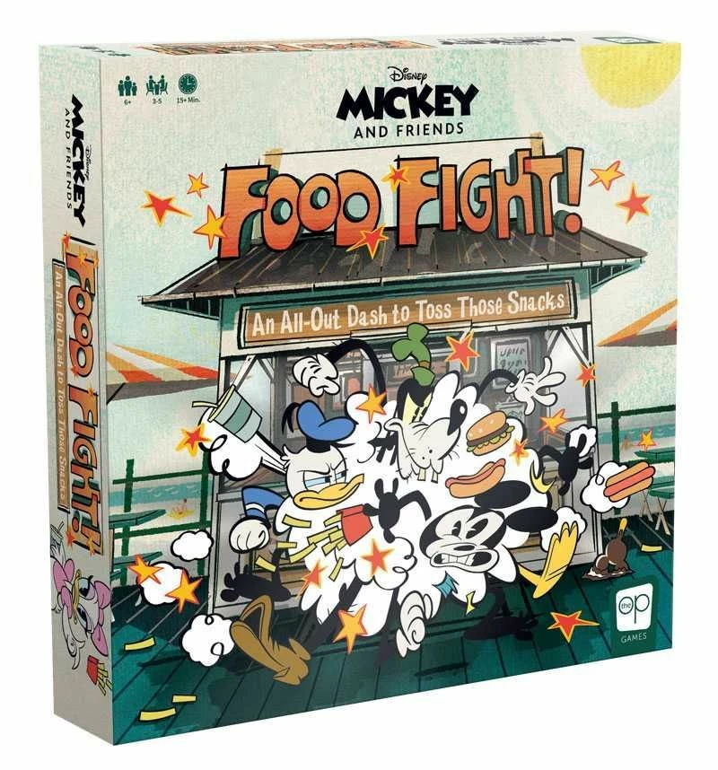 A nostalgic invitation to play inspired by the Mickey Short “No Service”! It’s a carefree day at the beach with your favorite Disney friends, until a lunchtime food fight ensues! Get in on a chaos of concessions by tossing different dishes and treats from the Snack Shack to clear your tray the fastest! Simultaneously roll dice and follow what types of food to toss, how many, and in which direction… while avoiding others’ food! Empty your tray and be the first player with three Mickey Medals to win the Mickey and Friends Food Fight!