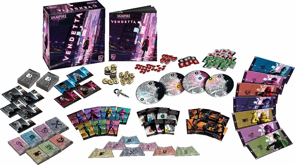 Vampire: The Masquerade – Vendetta is an asymmetrical competitive card game of strategy, bluff, and deduction, designed by renowned game designers Charlie Cleveland (Subnautica) and Bruno Faidutti (Citadels). 3 to 5 players will take control of one of the scheming vampires and fight at several locations to win the support of influential allies and ultimately challenge the throne of Chicago.