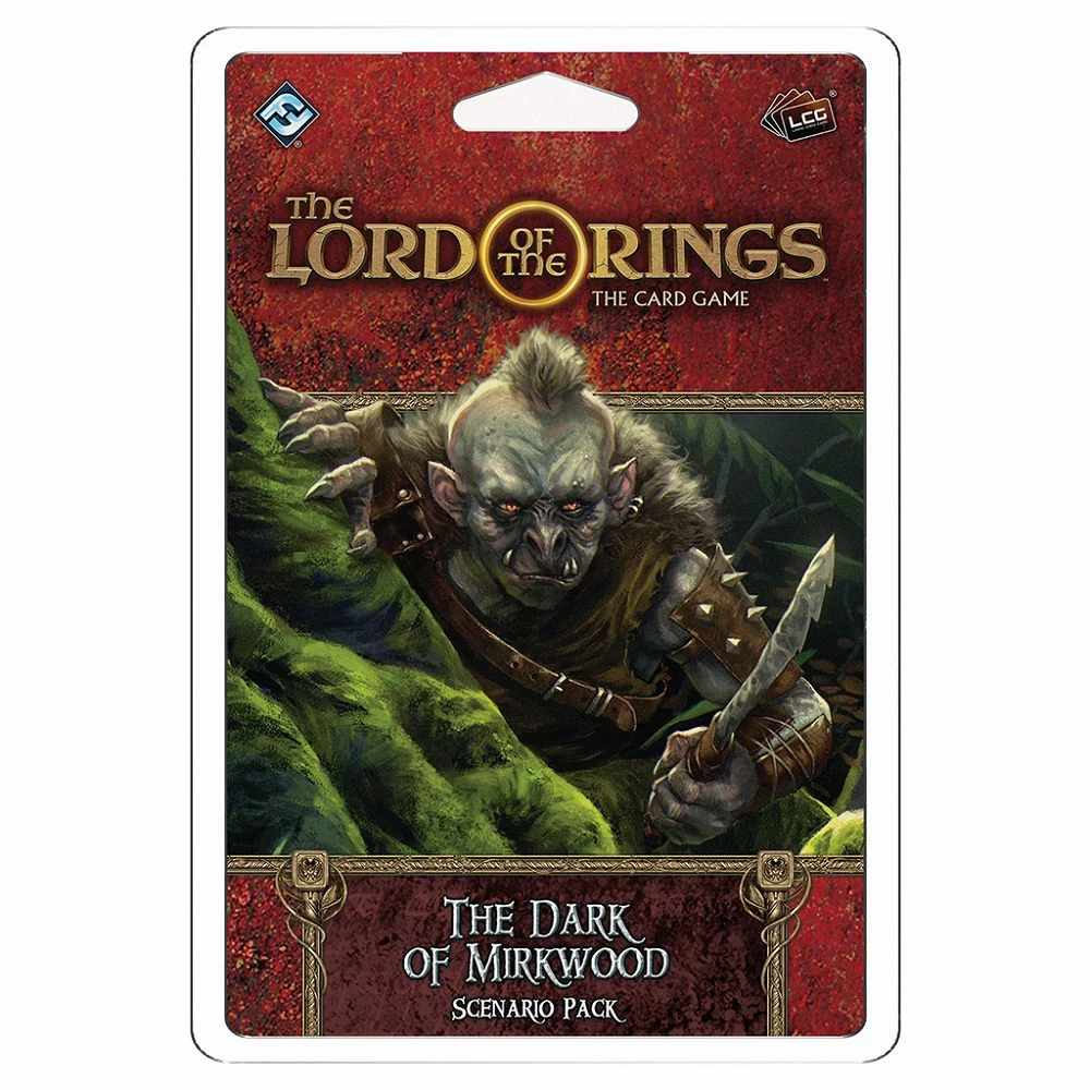 Brave the perils of forest and cave in The Dark of Mirkwood, an 82-card expansion for The Lord of the Rings: The Card Game that features two scenarios! A group of wicked Goblins have raided a settlement on the eaves of Mirkwood, taking the woodmen as their captives. Pursue them into the forest in The Oath, and venture deep into their lair to perform a daring rescue in The Caves of Nibin-Dum.