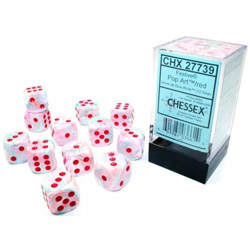 A set of festive pop-art dice with red pips. These dice are black-light reactive.