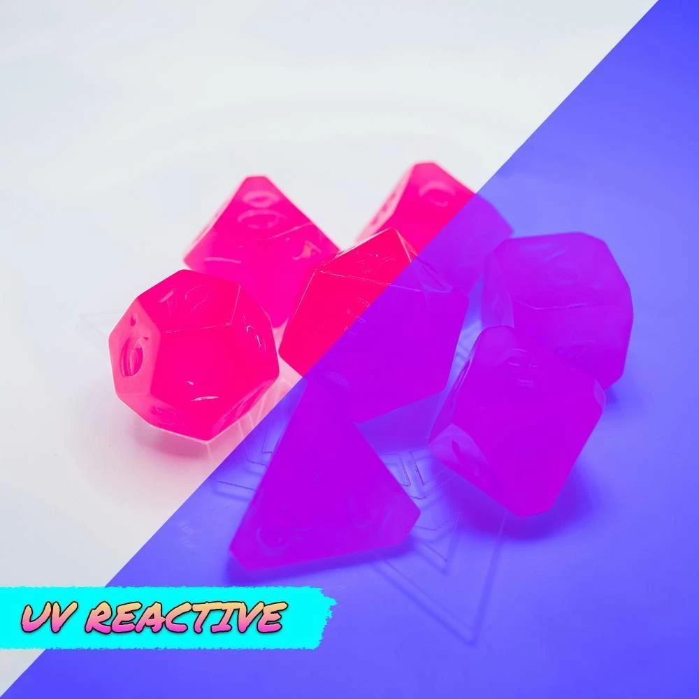 Every adventure party needs a little light in dark places sometimes! Kick your party off with AfterDark Avalore Funky Town: UV reactive dice that illuminate brilliantly under blacklight! Inspired by roller rinks, diner jukeboxes, and celebrations, AfterDark Avalore is sure to brighten the table mood at your next tabletop roleplaying game!