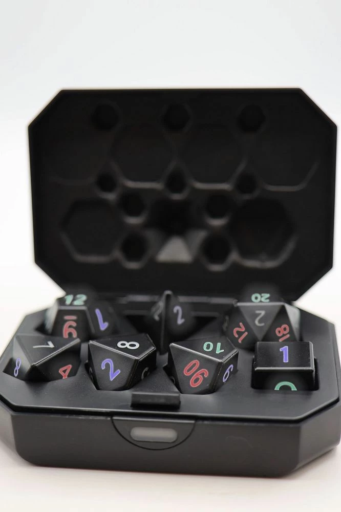 These super cool dice are a matte black until you shake or roll them – they have an action activated LED light that blinks various colors for approximately 10 seconds after you roll them.