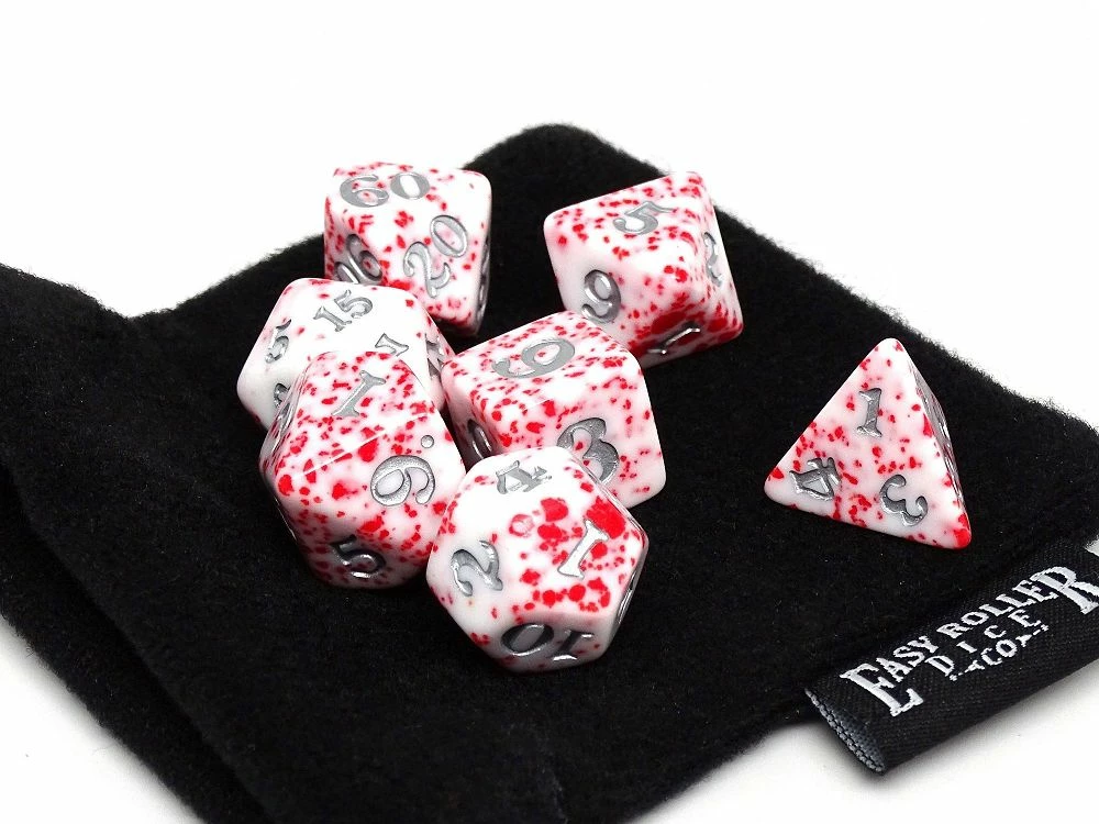 Each dice set includes a small dice bag from Easy Roller Dice Company at no additional charge. These dice bags can hole about 21 dice, and include a drawstring closure.