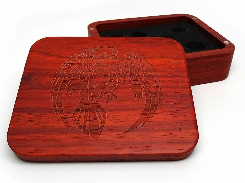 This wooden dice case measures approximately 4.5 x 3.75 x 1.5 inches and includes a removable foam insert – perfect for storing your best 7 piece set of polyhedral dice.