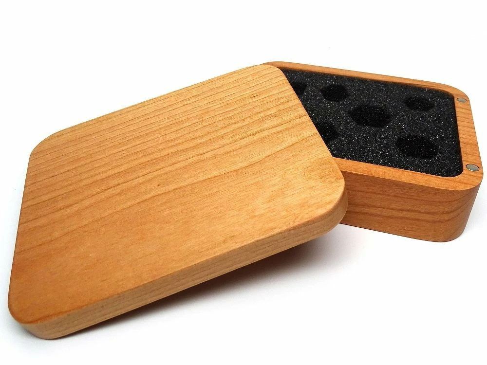 This wooden dice case measures approximately 4.5 x 3.75 x 1.5 inches and includes a removable foam insert – perfect for storing your best 7 piece set of polyhedral dice.