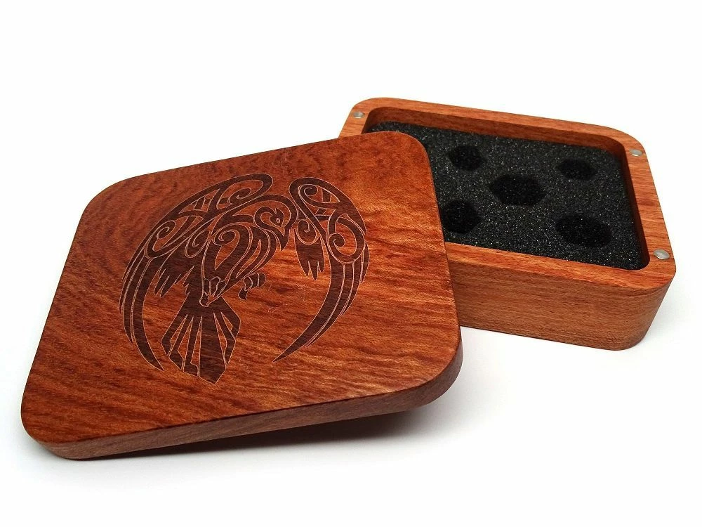 This wooden dice case measures approximately 4.5 x 3.75 x 1.5 inches and includes a removable foam insert – perfect for storing your best 7 piece set of polyhedral dice.