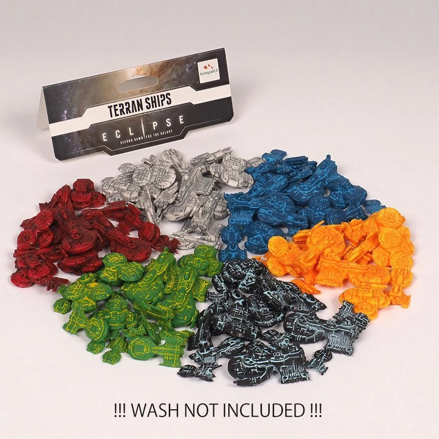 The Eclipse – 2nd Dawn for the Galaxy base game includes ships for six different alien species. Eclipse – 2nd Dawn: Terran Ships adds 18 Terran Ships in each player color, so everyone can easily see who has chosen to play as Terrans.