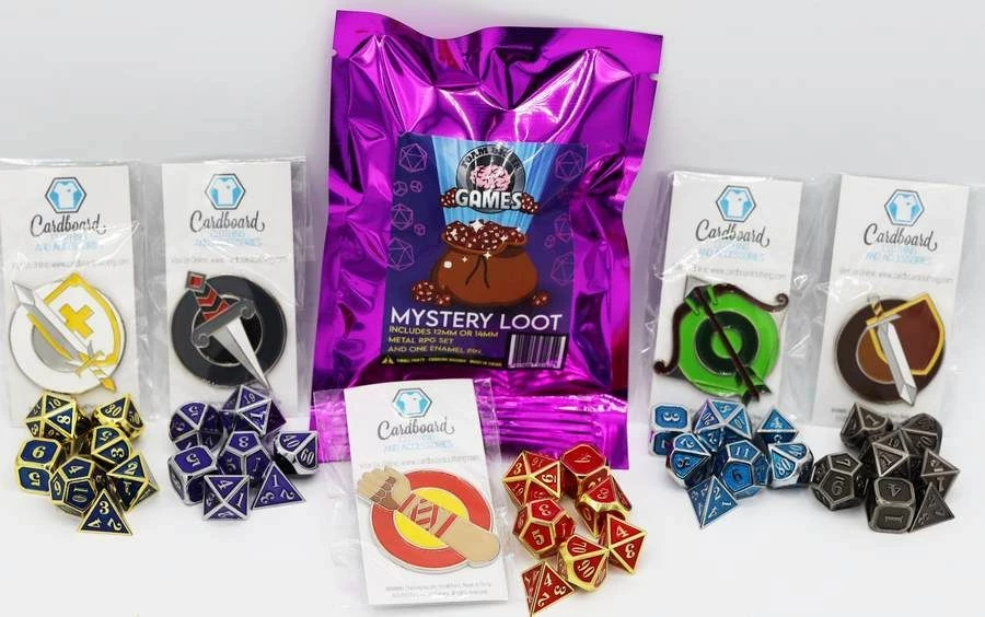 Contains (1) 12mm or 14mm Metal RPG Set (matching set) and 1 Random Enamel Pin, in a sealed mystery package!