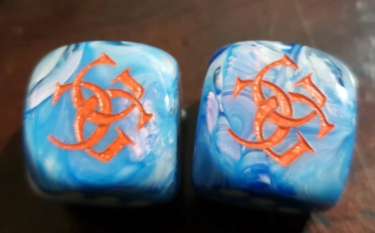 Show your store pride by using dice with our logo! Beautiful iridescent swirls in a mix of blue and white and our eye-catching orange logo will make your dice the envy of the table.