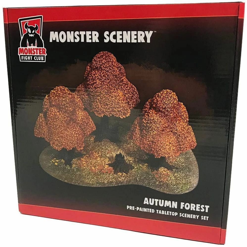 The Autumn Forest contains three (3) pre-painted plastic trees with removable orange leaf tops, a tree stump scenery piece, and a double-sided neoprene area template. One side of the template is a forest floor, the other a small pond.