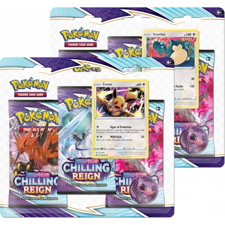 Each 3 Pack blister comes with 3 Chilling Reign booster packs, 1 coin, and a promotional card of Eevee or Snorlax.