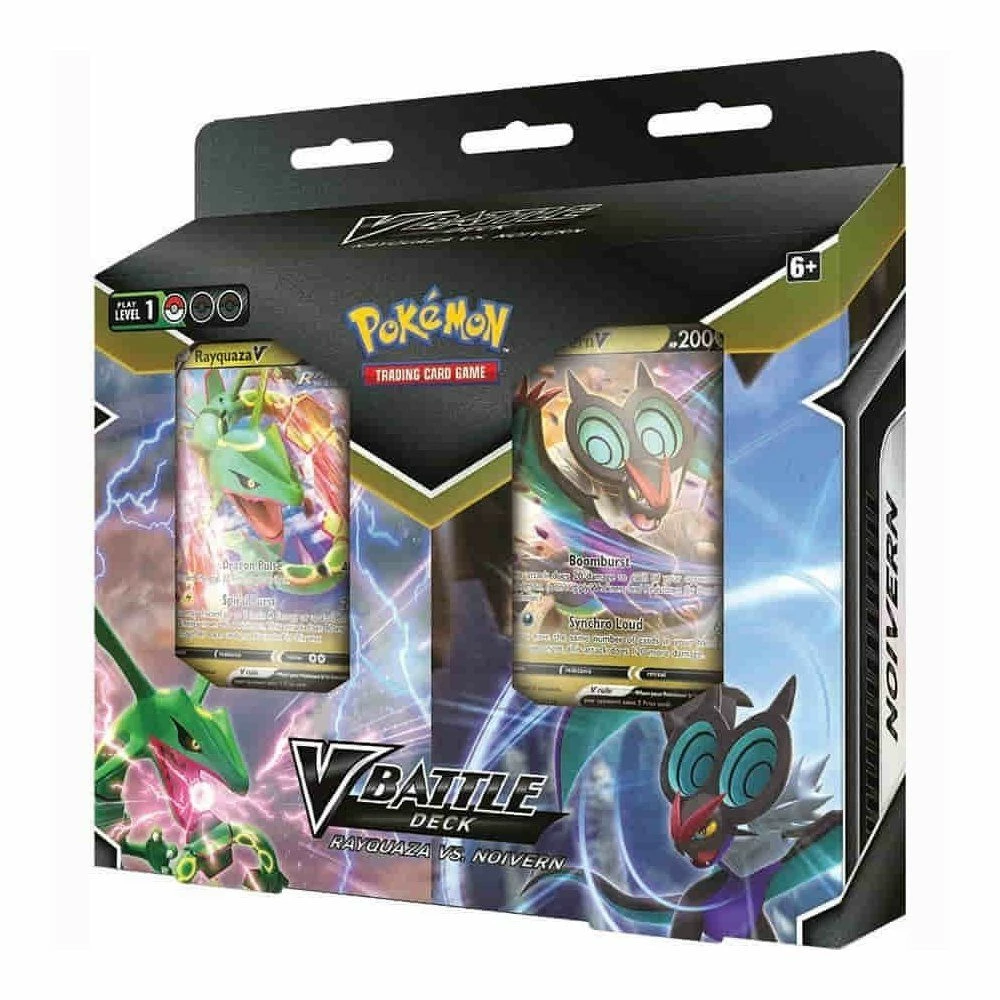 Two Strong Pokémon V Stand Ready! Get ready for a major Pokémon battle with a ready-to-play double deck bundle—with extra Trainer cards! The Pokémon TCG: V Battle Deck—Rayquaza vs. Noivern includes a deck for you and one for a friend, so you can face off. You can choose either Rayquaza V or Noivern V to lead your team in a headsup battle against another Trainer. Then, switch up the decks and see what things look like from the other side—can you win with both powerful Pokémon V? The Pokémon TCG: V Battle Deck—Rayquaza vs. Noivern includes: