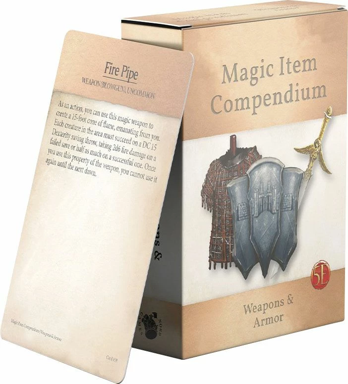 The 4 Magic Item compendium decks are 50 card decks containing items from the book. The cards are going to have one side be the art of the item and the other rules and stats for each item. Each item will have a color banner on both sides to show the rarity of the items for quick reference.