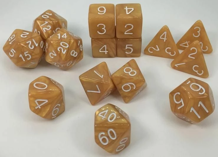 15 Die Sets contain 3 x d4, 4 x d6, 2 x d8, d10, d12, 3 x d20 and a percentile die. These sets are 20% larger, have bold numbers for better visibility, sharper edges for better randomization and are customized for some of the most popular tabletop RPGs.
