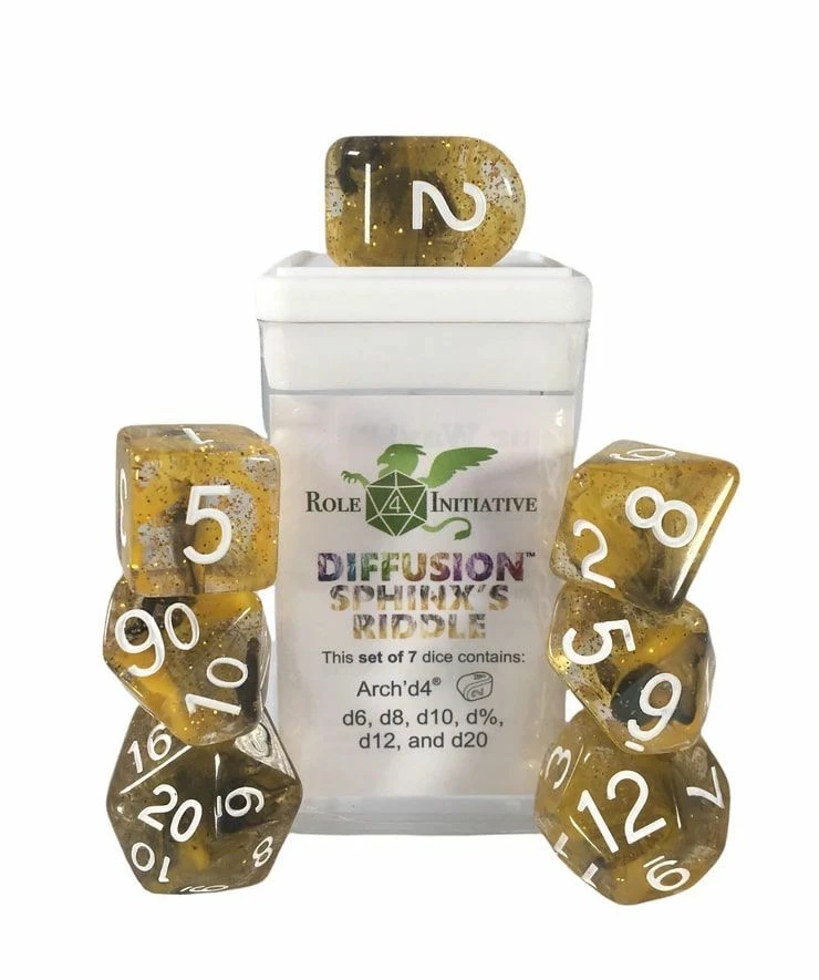 Available in singles, sets of 7 (Arch’d4 or traditional d4, d6, d8, d10, d%, d12, and d20), and sets of 15 (3 Arch’d4 or traditional d4, 4d6, 2d8, 2d10, d%, d12, and 2d20)