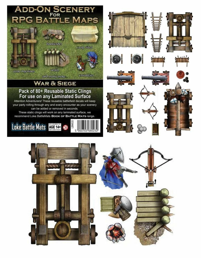 Attention Adventurers! These reusable war & siege themed decals will keep your party roll-ing through any and every encounter as your adventure can be personalised in seconds! These static clings will work on any laminated RPG map to instantly add siege weapons, camps, casualties, walls and many more details!