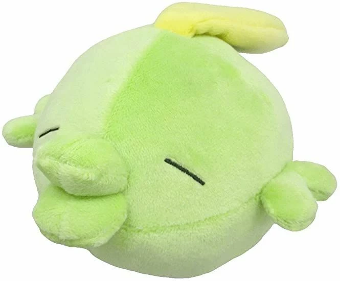 Gulpin is a round, green, amorphous Pokémon. It has a black diamond marking on its back and a yellow feather-like adornment on its head. A female has a shorter feather than a male. Its face consists of puckered lips and slanted eyes that are usually closed. It has two stubby appendages that are the same shape as its lips. It swallows anything of its own size whole, since its stomach comprises most of its body. Its heart and brain are very small in comparison to its stomach. The unique stomach acid it has allows it to digest almost anything. When it is digesting, vile, overpowering gases are expelled. It lives in grassy areas.
