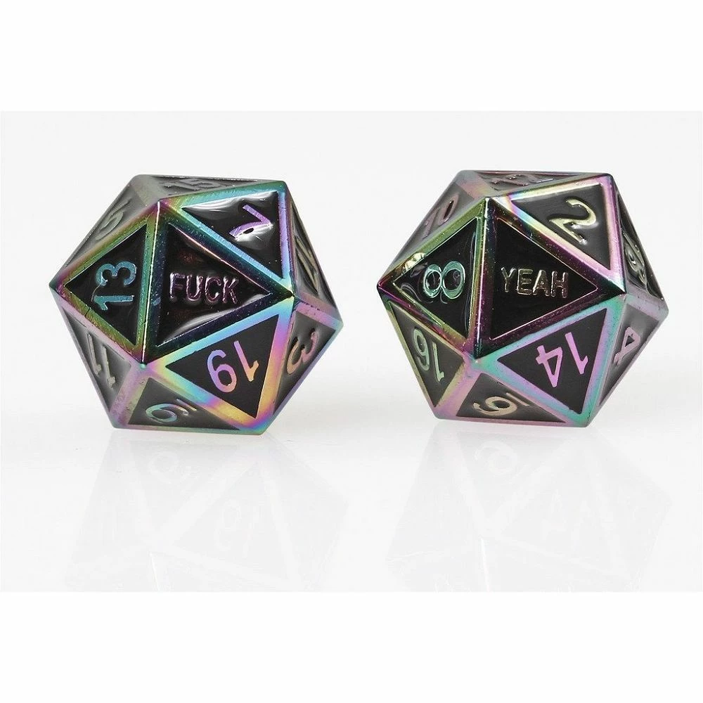 Each set of 2 D20 comes in a custom tin with the 20 replaced with “YEAH” and the 1 replaced with “FUCK”