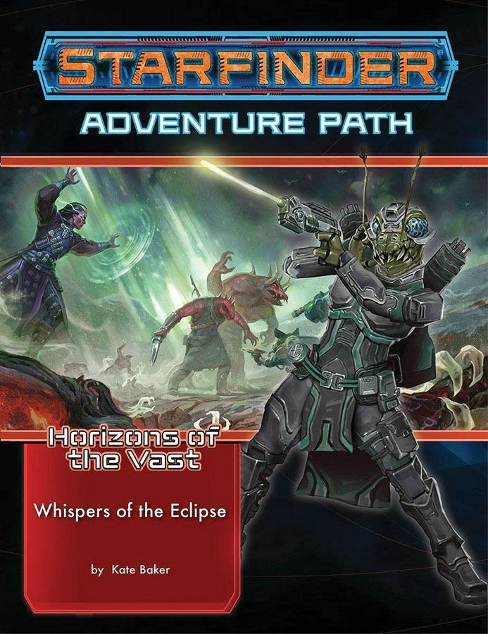 Whispers of the Eclipse is a Starfinder Roleplaying Game adventure for four 5th-level characters by Kate Baker. This adventure continues the Horizons of the Vast Adventure Path, a six-part, bimonthly campaign in which the heroes are at the forefront of exploring and charting a newly discovered world filled with mystery. This volume also includes a history of the diaspora of the elves, gear from an ancient spacefaring civilization, and a selection of diverse alien creatures.