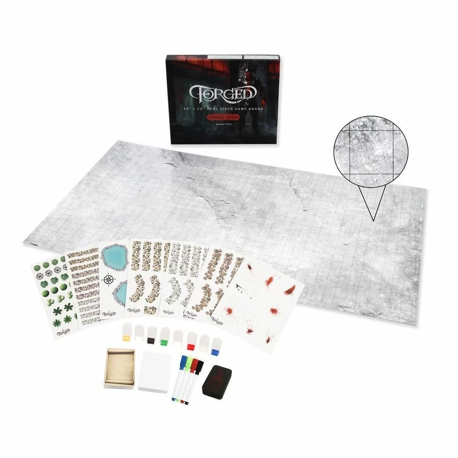 DELUXE EDITION: Need the complete package for your next tabletop game? Our deluxe edition dry erase game board includes 1 deck of 54 white dry erase cards, 1 deck of 54 parchment scroll dry erase cards, set of 4 dry erase markers, Set of 8 dry erase player pawns, 1 eraser, and a 7 set of our custom static cling landscape and blood splatter stick ons.