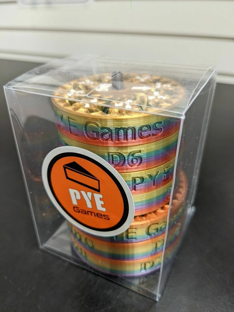 A fidget spinner that produces a die roll result with each spin. Each set contains spinners for D4, D6, D8, D10m D12, D20, and D00.