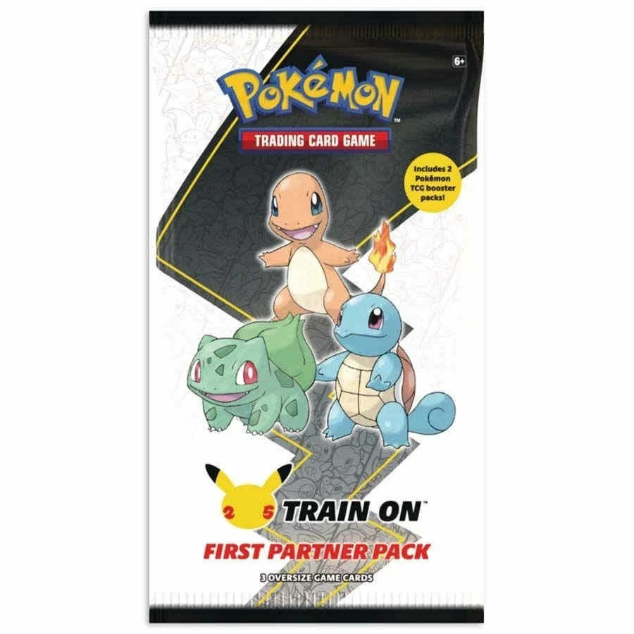 A big celebration — with gigantic Pokémon TCG cards! This First Partner Pack contains a set of 3 awesome oversize cards for your Pokémon TCG collection, featuring the three first partner Pokémon of the Kanto region — Bulbasaur, Charmander, and Squirtle — plus two regular Pokémon TCG booster packs! Collect your favorites, trade them, and celebrate 25 awesome years of Pokémon with the first partners who stick with you from your very first Pokémon moments!