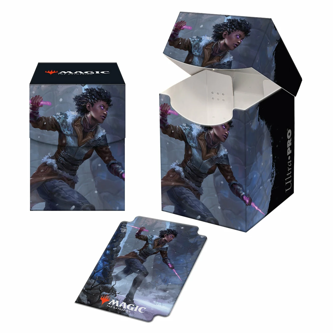 Show up to your next game night in style with the PRO 100+ Deck Box featuring art from Magic: the Gathering set releasing January 2021! This deck box holds 100 double-sleeved cards and includes a matching card divider for premium deck organization. PRO 100+ Deck Boxes are light, easy to carry, and made with archival-safe, rigid polypropylene material to protect your cards. The self-locking lid design provides secure storage for your cards. With full color printing and limited production, this Deck Box is a great addition to any MTG collection.