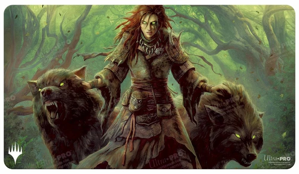 Playmats feature popular Magic: The Gathering artwork of Faldorn, Dread Wolf Herald by Jason A. Engle. Made with a soft fabric top to reduce damage to cards during play and a non-slip rubber backing to keep the playmat from shifting during use, playmats enhance the gameplay experience. With dimensions of approximately 24 in. x 13.5 in., a playmat also makes an excellent oversize mousepad for home or office.