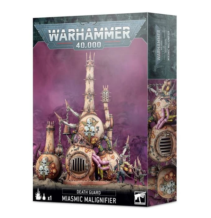 Festooned with swaying plague censers and tainted bells, Miasmic Malignifiers belch thick clouds of miasmal fumes from their rusted chimneys. Sown like spores across target worlds, they are parasites that suck filth from the ground and latch themselves on to local infrastructure, polluting the world on every level.