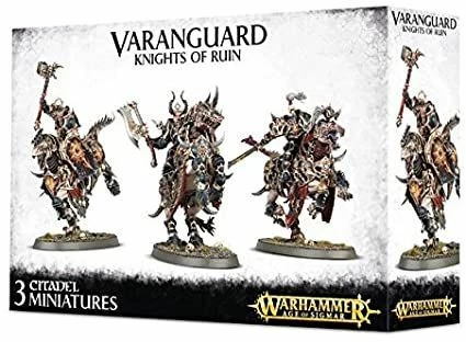 This multi-part plastic kit contains all the components necessary to assemble three Varanguard Knights, sinister champions of Archaon. Each knight rides a daemonic steed – a barely-recognisable, twisted mutation of a horse covered in brutal armour. The kit comes with a hammer, an axe, a sword, three spears and three shields, six heads (three bare, three helmeted) and six shoulder pads – your emissaries of Archaon will look exactly as harsh as you want them to!
