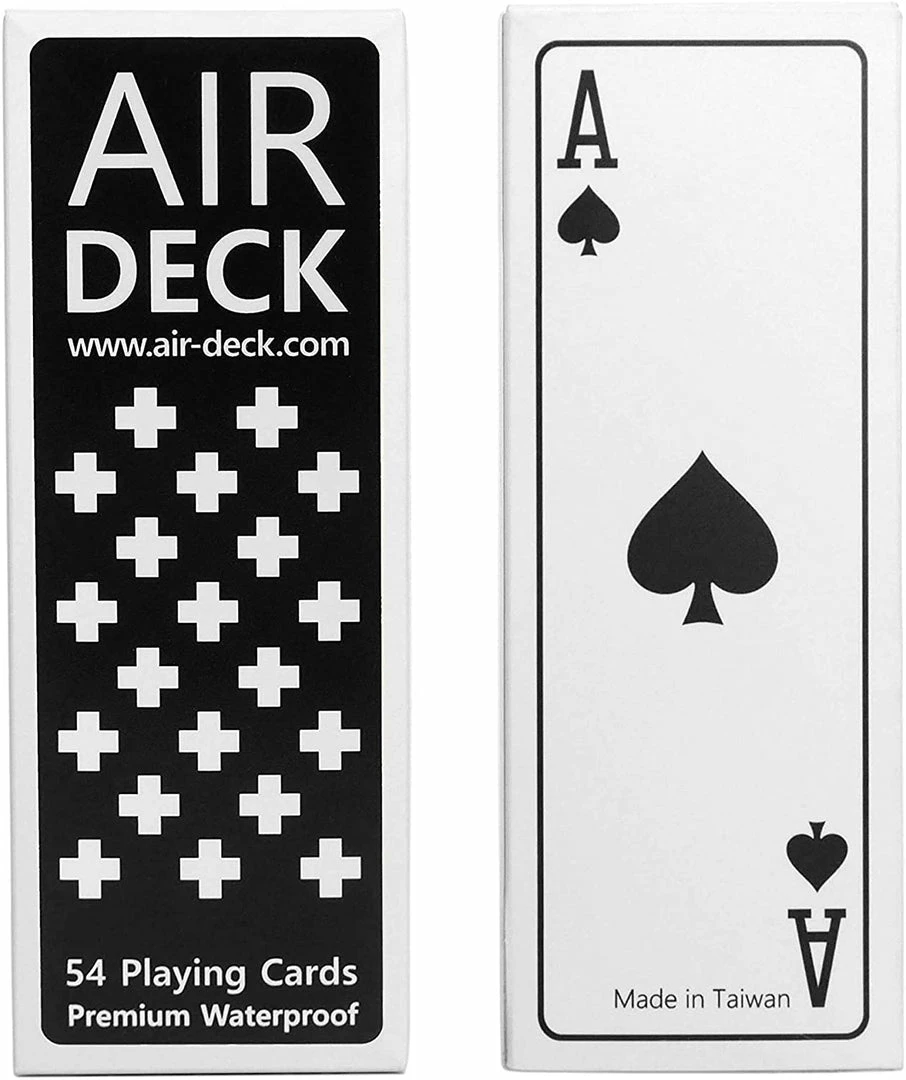 Air deck is the ultimate playing cards for travelers. These professional grade cards handle very well, takes up little space and fits easily into your pocket. With the Air deck, you can play everywhere anytime, whether playing on the train or on a play tray table. While regular paper playing cards tear, Stain, bend and break easily, the air deck is incredibly resistant to abuse, and 100% waterproof. The minimalist design combined with the unusual form factor will make the air deck a sure fire conversation starter on your travels. Available in black, white and red.