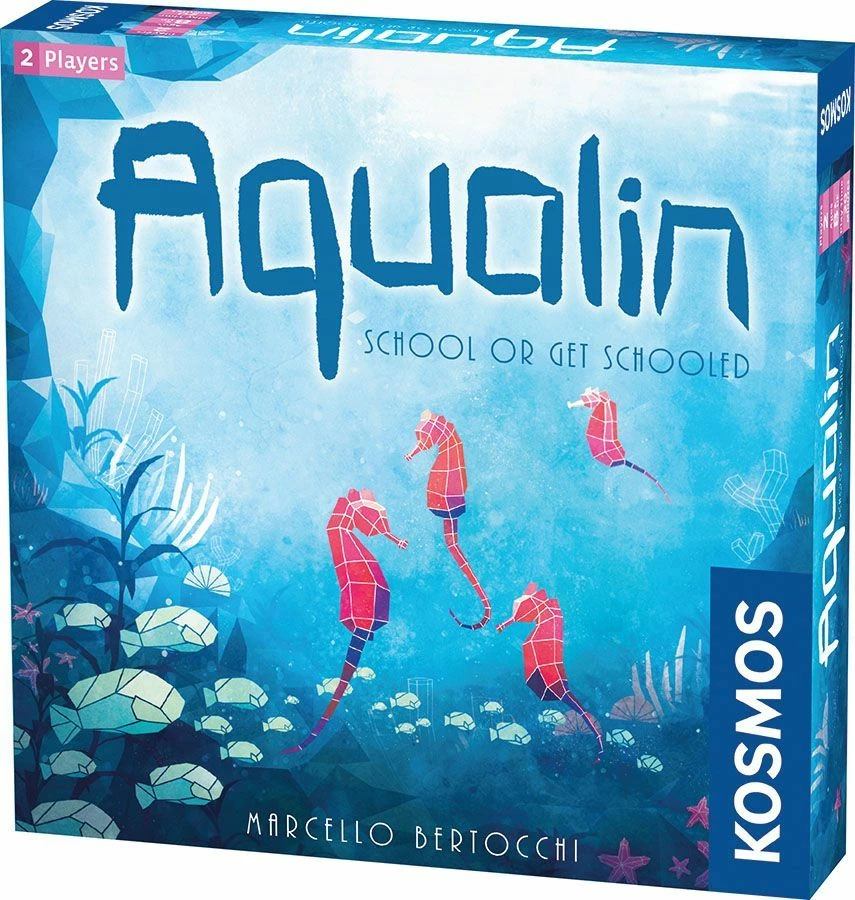 Aqualin is a two-player strategy game that is easy to learn but challenging to master. During the game, each player attempts to group together as many matching tiles as possible, and to form the most groups. One player works to create groups of the same color, while the other makes groups of the same type of sea creature. The bigger the group is, the more points its worth.
