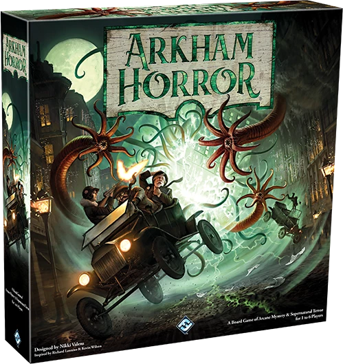 Arkham Horror (Third Edition) is a cooperative board game for one to six players who take on the roles of investigators trying to rid the world of eldritch beings known as Ancient Ones. Based on the works of H.P. Lovecraft, players will have to gather clues, defeat terrifying monsters, and find tools and allies if they are to stand any chance of defeating the creatures that dwell just beyond the veil of our reality.