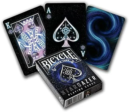 Get lost in space with this beautifully illustrated deck of cards. Bicycle® playing cards Stargazer features designs and colors inspired by one of the most mysterious and awesome objects in the galaxy, the black hole. The tuck case brings the brilliance of the stars to life with the use of reflective silver foil.