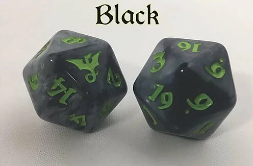 The dragons are attacking! The Dragon d20 comes in several color options and is larger than standard sized d20s (23mm instead of 20mm). It is sized up to match our Dragon d6s which are 19mm. These dice feature a lustrous pearlescent coloring meant to look like billowing dragon breath, a cool medieval era inspired font and a unique dragon design on the max value face.