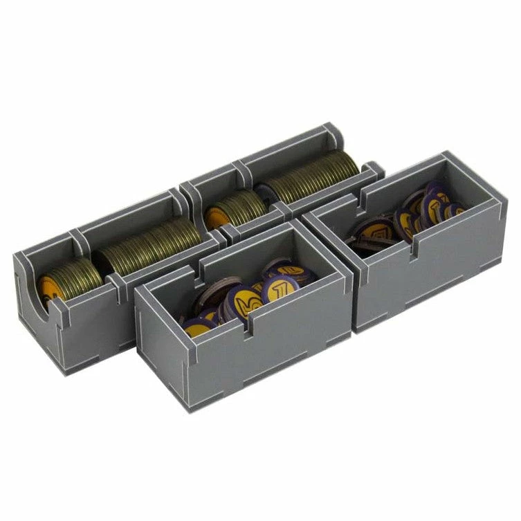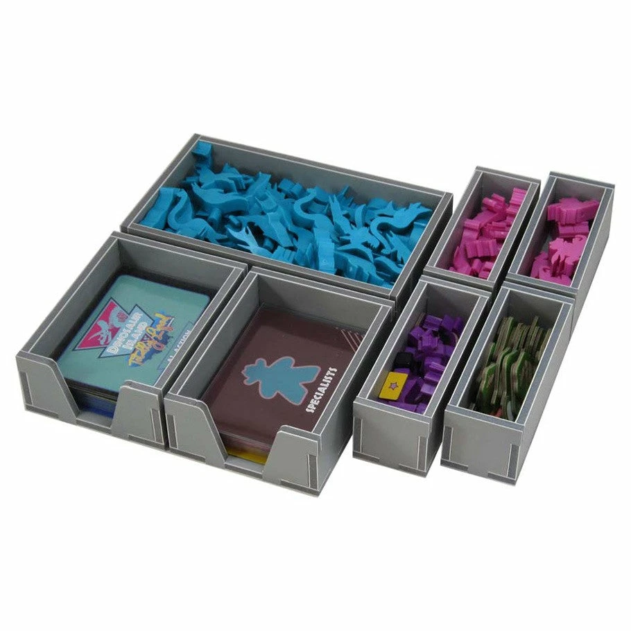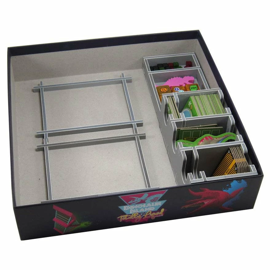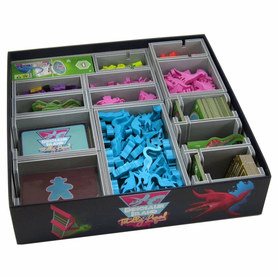 Insert compatible with Dinosaur Island Extreme Edition®. The design provides both efficient storage and improved game play. Many of the trays can be utilised during the game, and they greatly aid set-up and clear-away times. The rules and boards act as a lid on top of the trays.