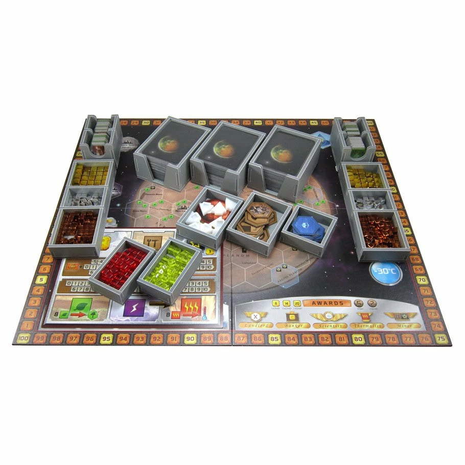 Insert compatible with Terraforming Mars®, and includes space for the Hellas & Elysium®, Venus Next®, Prelude® and Colonies® expansions. The design provides both efficient storage and improved game play. Many of the trays can be utilised during the game, and they greatly aid set-up and clear-away times. The boards and player boards act as a lid on top of the trays. There is space for all cards to be sleeved.