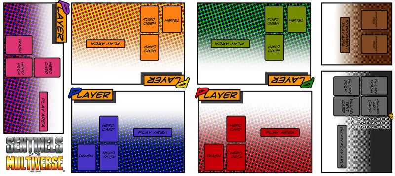 A full-color, 2′ x 4.6′ playmat printed with specific positions for decks, character cards, and trash for 3-5 Heroes, the Villain, and the Environment. Printed on high quality, scratch-resistant vinyl, these matts roll up concisely and resist damage.