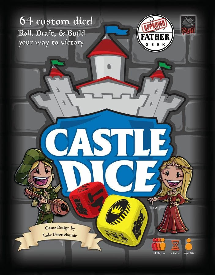 Castle Dice is a light dice-drafting game in which the players have been ordered by the king to build castles along the borders of the kingdom. The player who can create the greatest castle will become the new heir to the throne. Players will explore the land by rolling the dice, and then take turns gathering resources from them. These resources are then used to hire workers and improve castles. Players must gather and spend wisely as the Barbarians from the neighboring lands will attack players and steal their resources throughout the game. At the end of seven turns, the player who has built the greatest castle (earned the most victory points) wins the game!