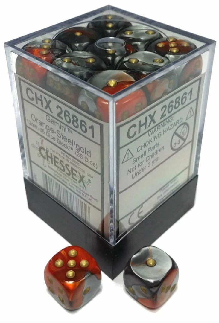 This Chessex dice set is simple and easy to read orange-steel mix with gold numbering. Great for people beginning a die collection or just looking for a new dice set to increase their rolling options.