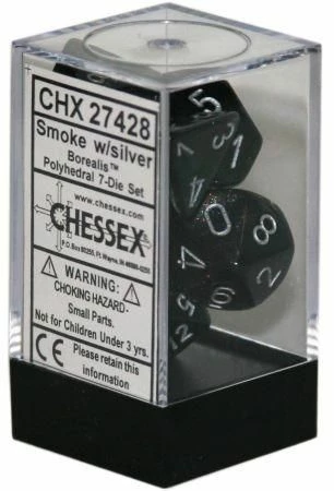 This Chessex dice set is simple and easy to read borealis smoke with silver numbering. Great for people beginning a die collection or just looking for a new dice set to increase their rolling options.