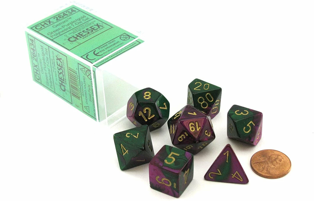 This Chessex dice set is simple and easy to read green-purple mix with gold numbering. Great for people beginning a die collection or just looking for a new dice set to increase their rolling options.