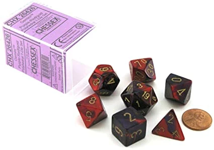 This Chessex dice set is simple and easy to read purple-red mix with gold numbering. Great for people beginning a die collection or just looking for a new dice set to increase their rolling options.