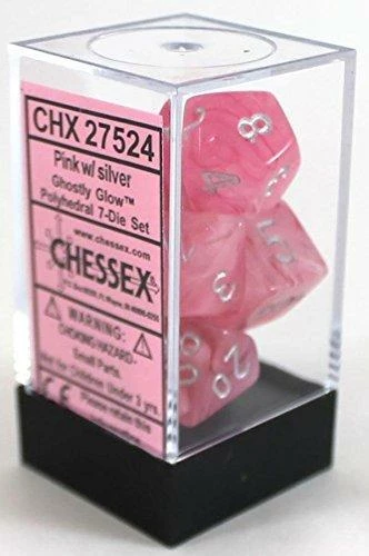 This Chessex dice set is simple and easy to read ghostly glow pink with silver numbering. Great for people beginning a die collection or just looking for a new dice set to increase their rolling options.