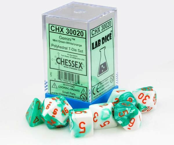 Chessex is launching a new line of dice: Lab Dice! This series allows them to release a lot of colors into the market, using public reaction to gauge which colors are the best to be integrated into their normal dice ranges. All Lab Dice are to be released in a blue-capped crystal marked ‘Lab Dice’. Even if a set becomes permanent, the Lab Dice label and blue cap crystal will be replaced with Chessex’s standard black-capped crystal and branding.